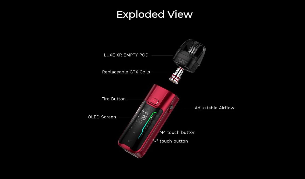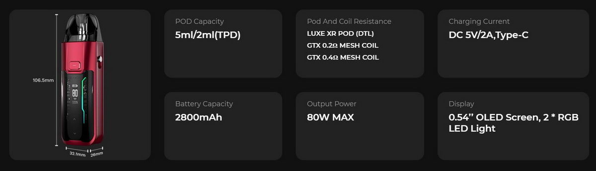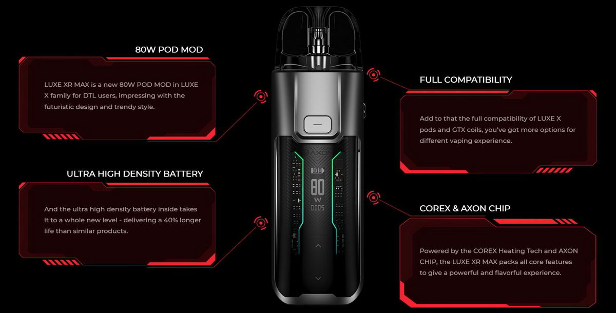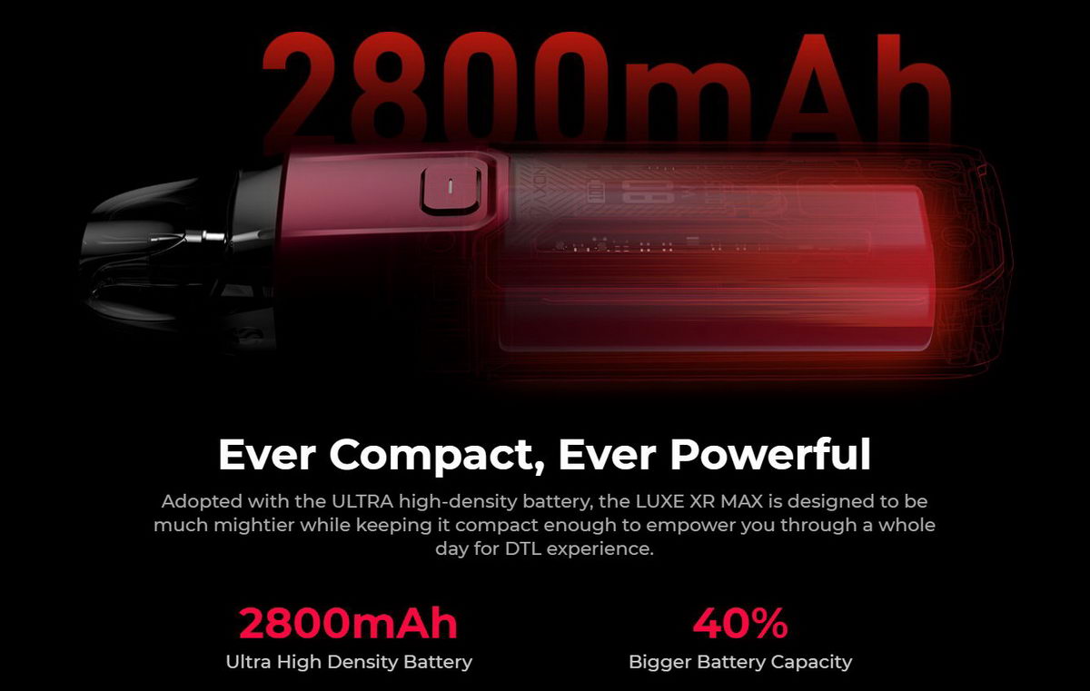 Luxe X je nova kolekcija POD uređaja iz kompanije Vaporesso. Luxe XR Max je najmoćniji model u ovoj kolekciji prvenstveno namenjen korisnicima koji vole veći protok vazduha i povlačenje direkt u pluća, restriktivno ili potpuno otvoreno (RDL ili DTL). U uređaj veoma zgodnih dimenzija je spakovana fantastična baterija od čak 2800mAh, kertridži su kapaciteta 3.5ml/5ml. U Luxe XR Max se mogu koristiti Luxe X kertridži sa integrisanim grejačima ili prazni kertridži u koje se postavljaju popularne Vaporesso GTX zamenske glave. Visok kvalitet izrade, jednostavnost korišćenja i zavidne performasne, uz dokazano kvalitetnu aromu koju pružaju GTX zamenske glave: sve ovo čini Luxe XR Max možda i najboljim modelom manjih dimenzija za nešto zahtevnije korisnike.
