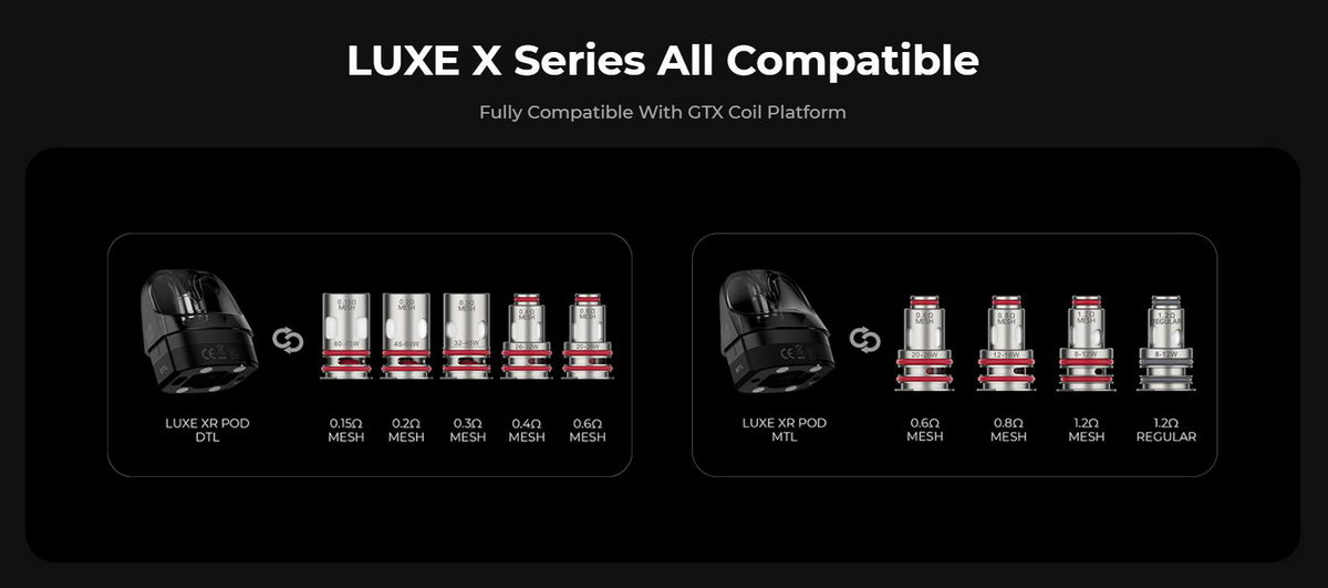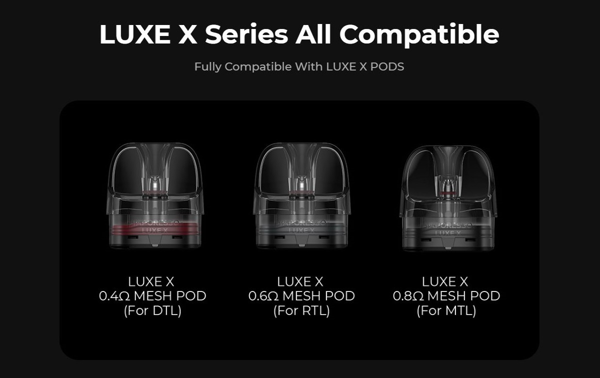 U ovom uređaju se mogu koristiti dve vrste kertridža: Luxe X kertridži sa integrisanim grejačima ili prazni Luxe XR Max kertridži u koje se postavljaju popularne Vaporesso GTX zamenske glave. GTX zamenske glave su dostupne u nekoliko varijanti. U kompletu se dobijaju glave otpora 0.2 oma i 0.4 oma, predviđene za DTL korišćenje. Ukoliko ste klasični MTL korisnik, GTX glave od 0.8 oma ili 1.2 oma bi za vas bile pravi izbor.