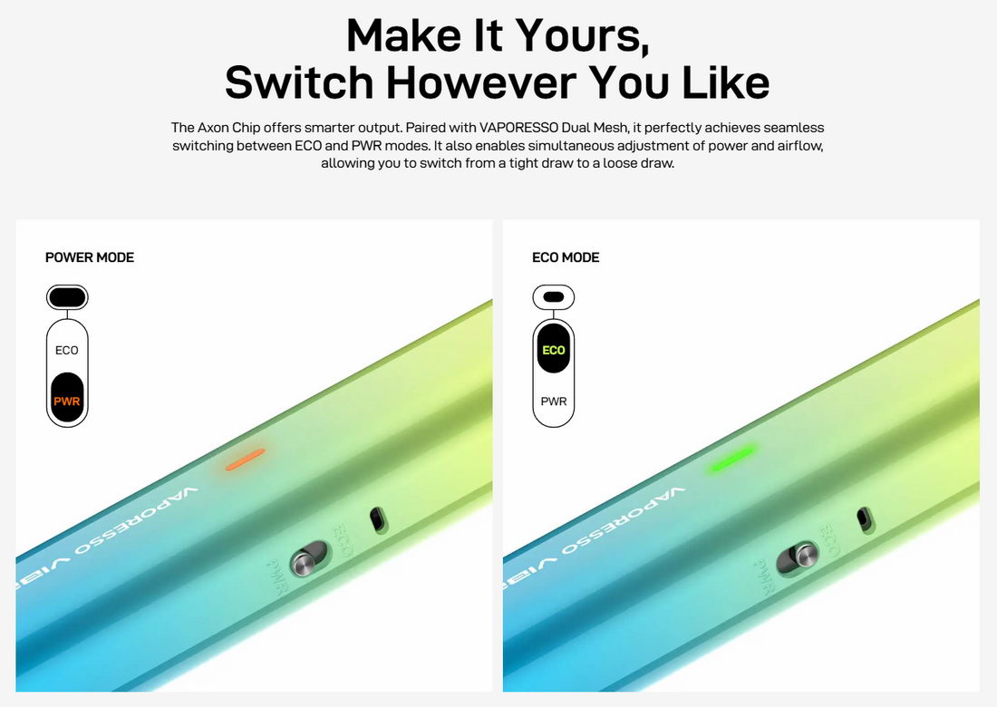 Za rad Vibe SE uređaja je zadužen poznati AXON elektronski čip, ovde prilagođen potrebama nove Dual Mesh tehnologije grejača. Dostupna su dva režima rada, ECO i POWER, promena je preko klizača na boku uređaja. Promenom režima se menja i protok vazduha.
