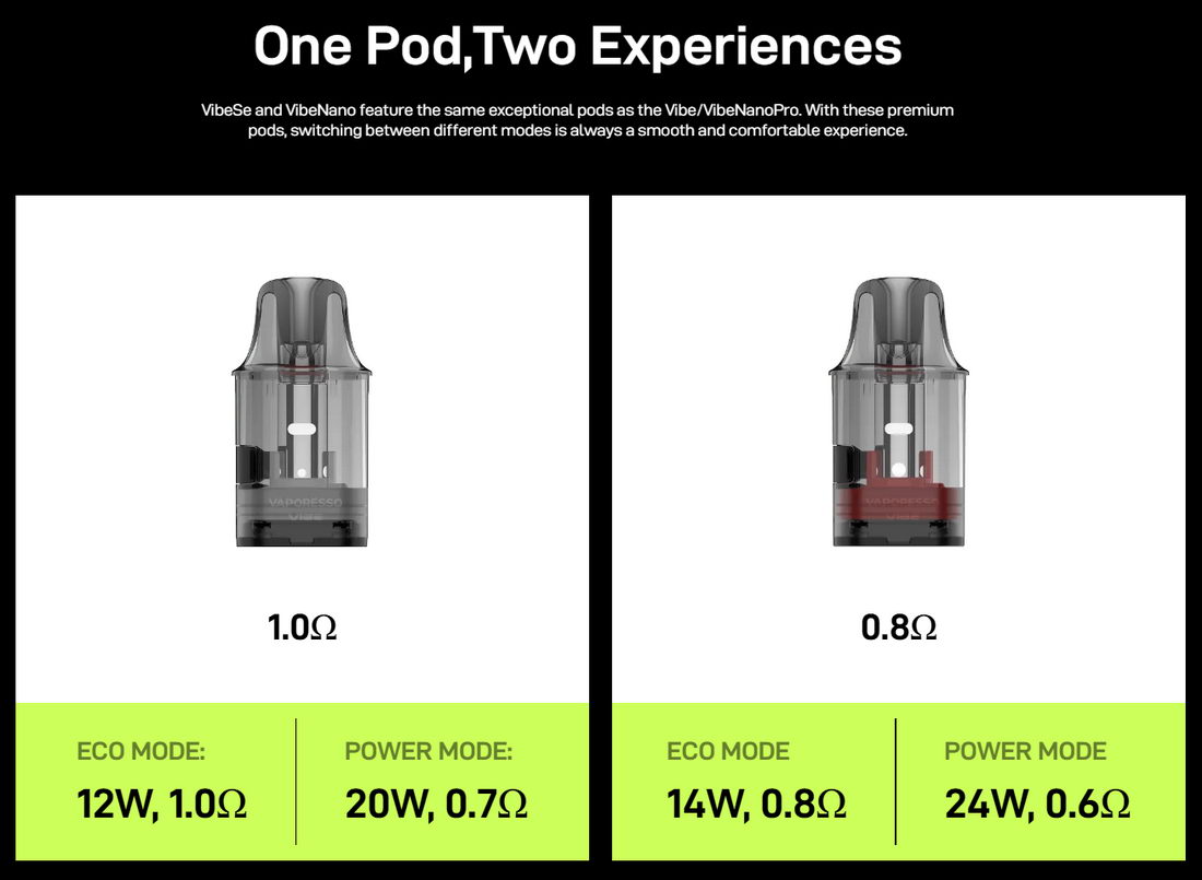 Zamenski kertridž za e-cigarete iz Vaporesso Vibe kolekcije. Prvi kertridž sa Dual Mesh tehnologijom, koja menja otpor grejača u zavisnosti od režima rada koji je korisnik aktivirao. Na taj način korisnik osetno menja kako ukus i intezitet, tako i trajanje samih kertridža.