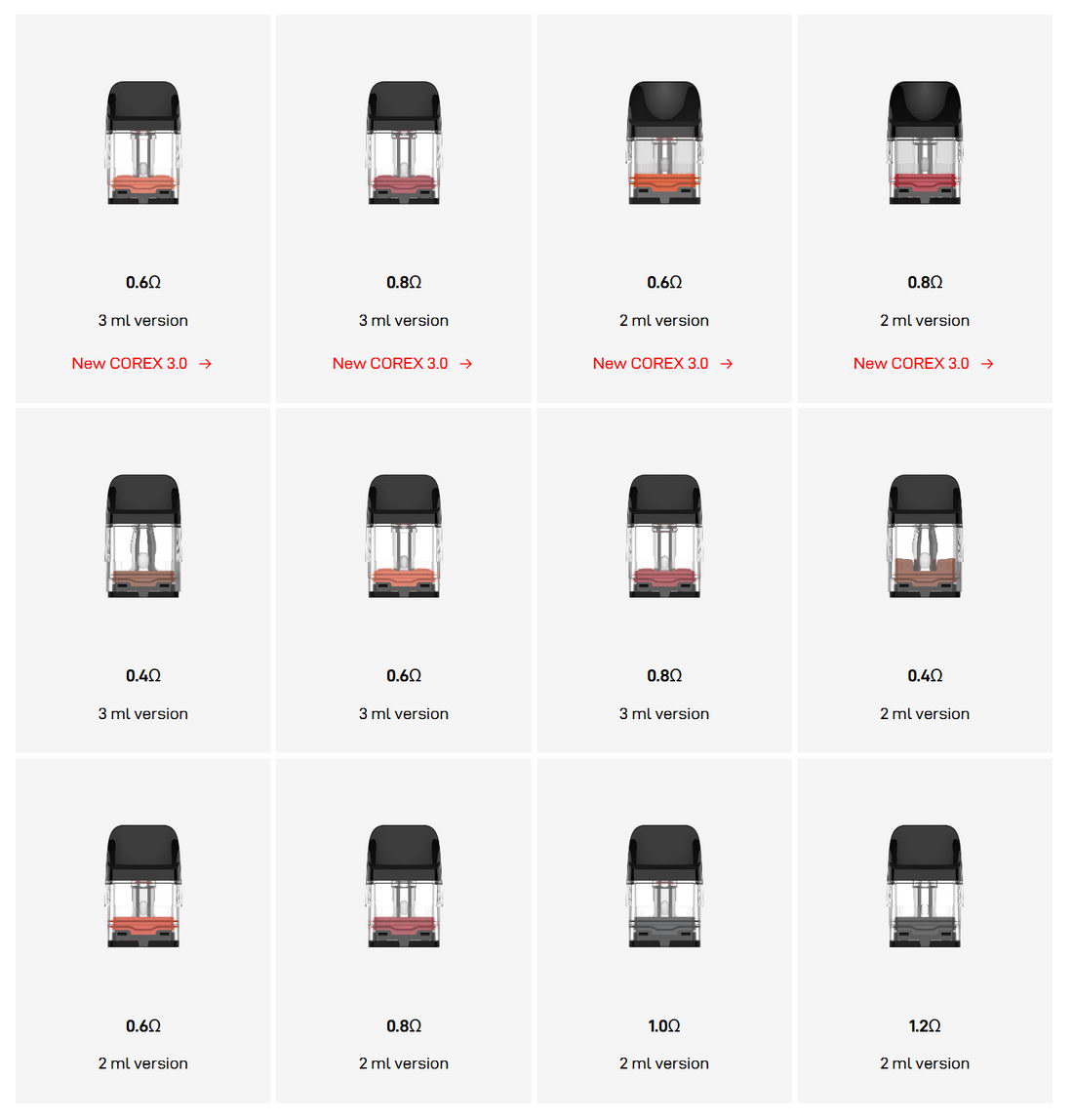 U XROS 5 kolekciji su predstavljeni XROS kertridži nove generacije sa oznakom Corex 3.0, koji će u narednim danima postati standard za XROS POD e-cigarete.Svi XROS modeli kertridža se mogu koristiti u ovom uređaju. Razlikuju se po otporu grejača, kapacitetu tanka i načinu dopunjavanja tečnosti.