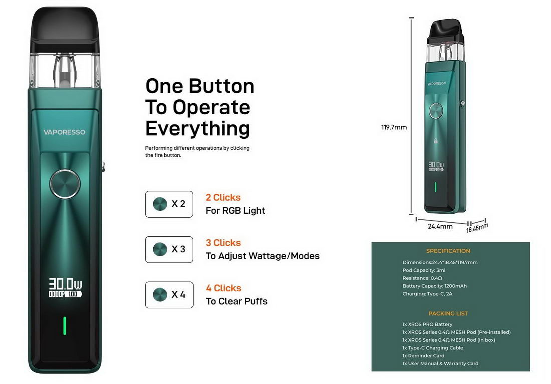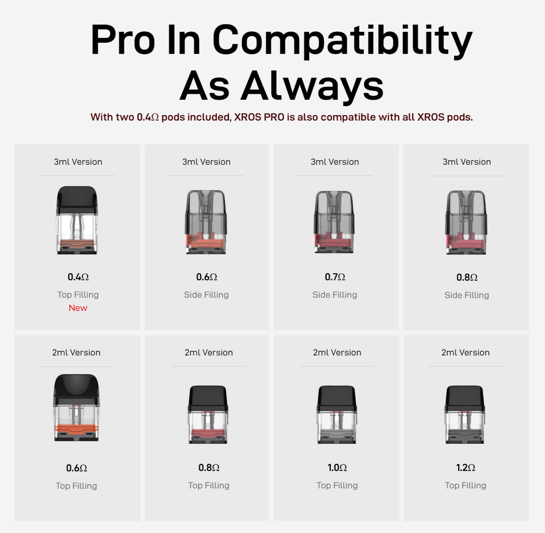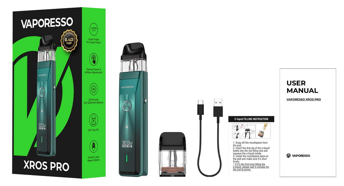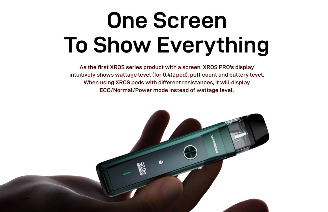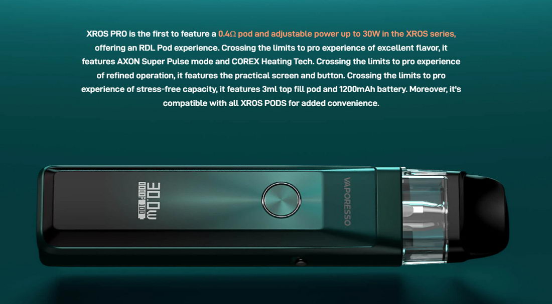 XROS PRO je najmoćniji model u XROS kolekciji POD uređaja kompanije Vaporesso. Donosi bateriju kapaciteta 1200mAh i novi XROS PRO kertridž otpora 0.4 oma, a kompatibilan je sa svim prethodnim modelima XROS kertridža. Sve to skupa, uz nekoliko interesantnih unapređenja, čine XROS PRO jednim od najboljih "naprednih" POD uređaja na tržištu.