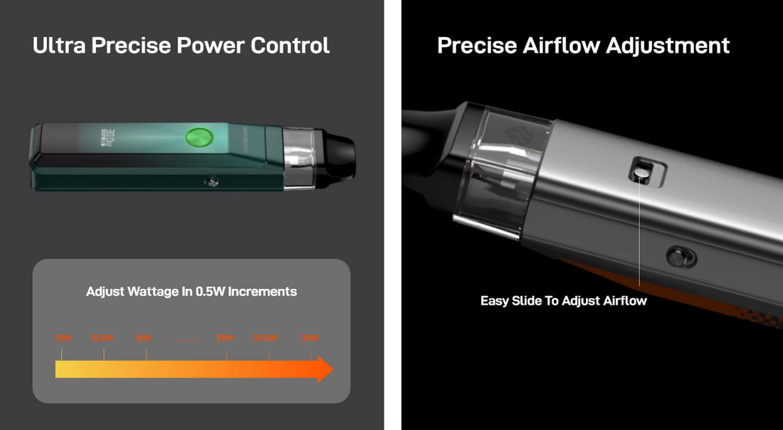 sa XROS PRO 0.4 oma kertridžom: na ekranu je, pored napunjenosti baterije i brojača povlačenja (puff counter) prikazana trenutno podešena izlazna snaga. Sa 3 klika prekidača ulazite u meni za podešavanje snage gde svaki klik povećava snagu za 0.5W. Nakon što dođe do 30W, vraća se na 15W.