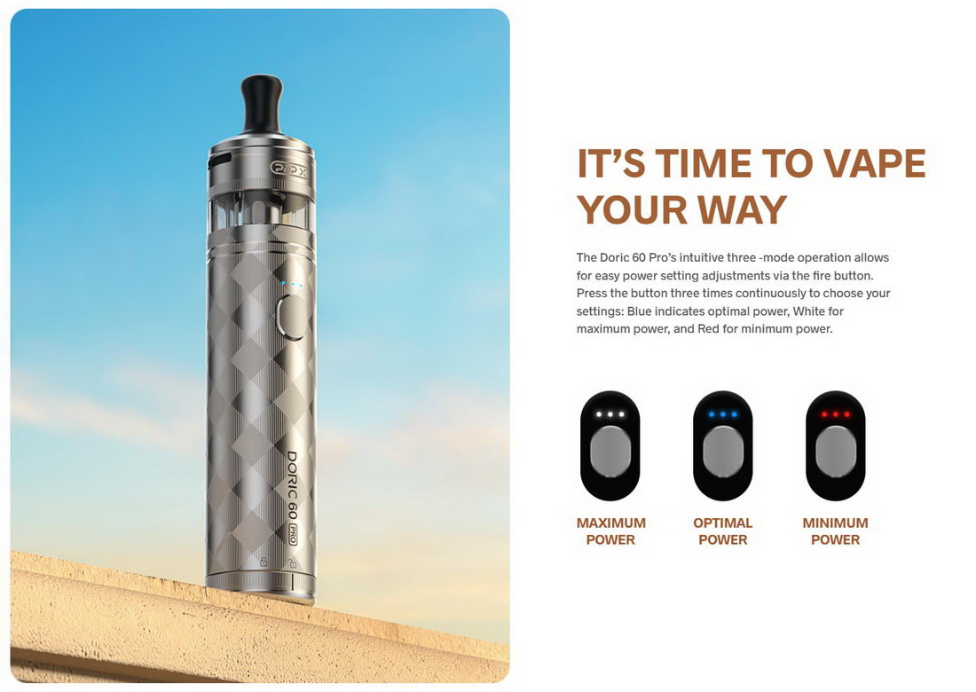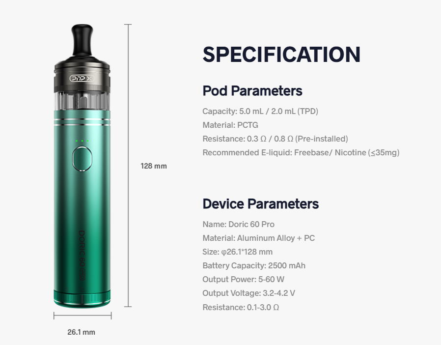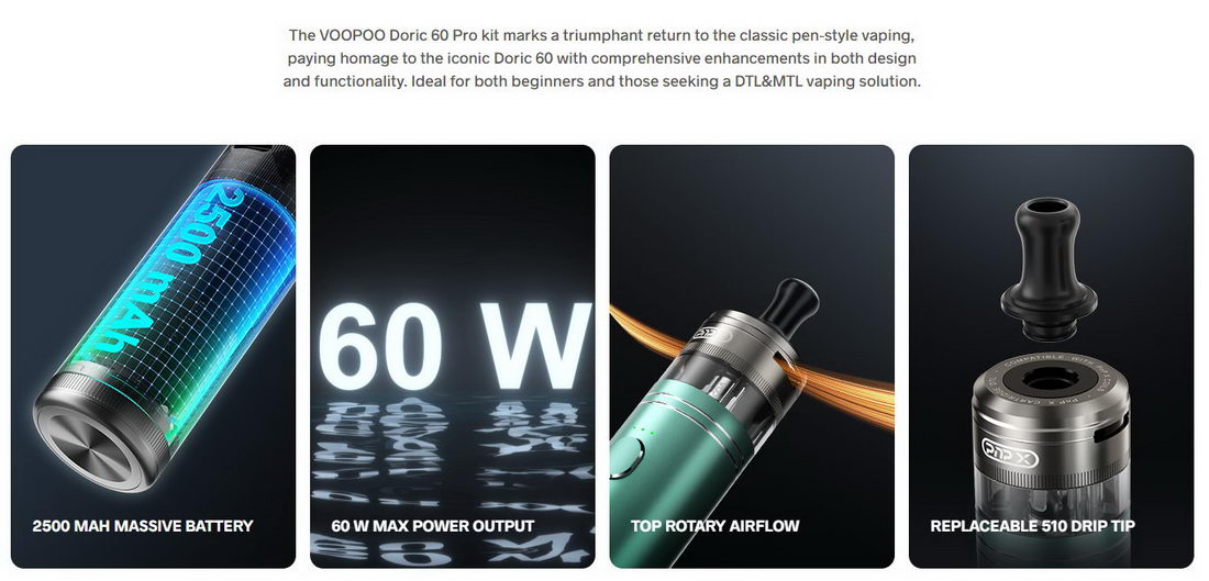 Doric 60 Pro je e-cigareta veoma jednostavna za korišćenje, uz impozantne performanse. Baterija kapaciteta 2500mAh i PnP X tank od 5ml garantuju užitak svim nezahtevnim korisnicima.