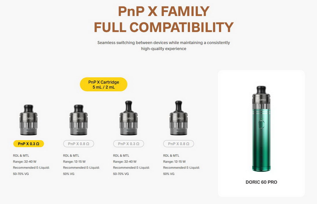 Doric 60 Pro je uglavnom predviđen za upotrebu sa standardnim e-tečnostima (tzv. Freebase tečnosti). Pošto su PnP X zamenske glave uglavnom nižeg otpora, nije preporučljivo koristiti NicSalt tečnosti u ovom uređaju. Više o POD sistemima i NicSalt tečnostima možete saznati na linku