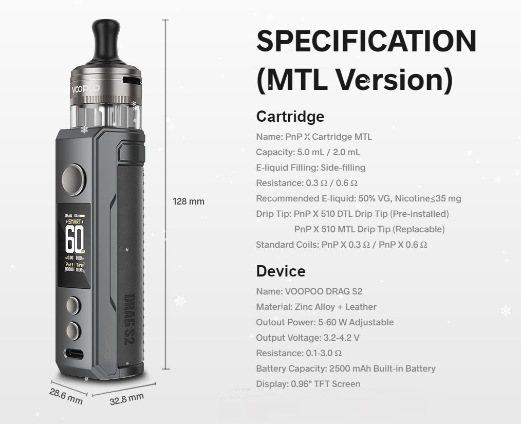 Drag S2 je predviđen za upotrebu sa standardnim e-tečnostima (tzv. Freebase tečnosti), pošto su PnP X zamenske glave uglavnom nižeg otpora nije preporučljivo koristiti NicSalt tečnosti u ovom uređaju. Više o POD sistemima i NicSalt tečnostima možete saznati na linku