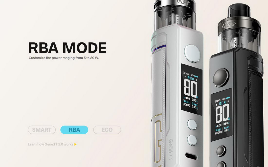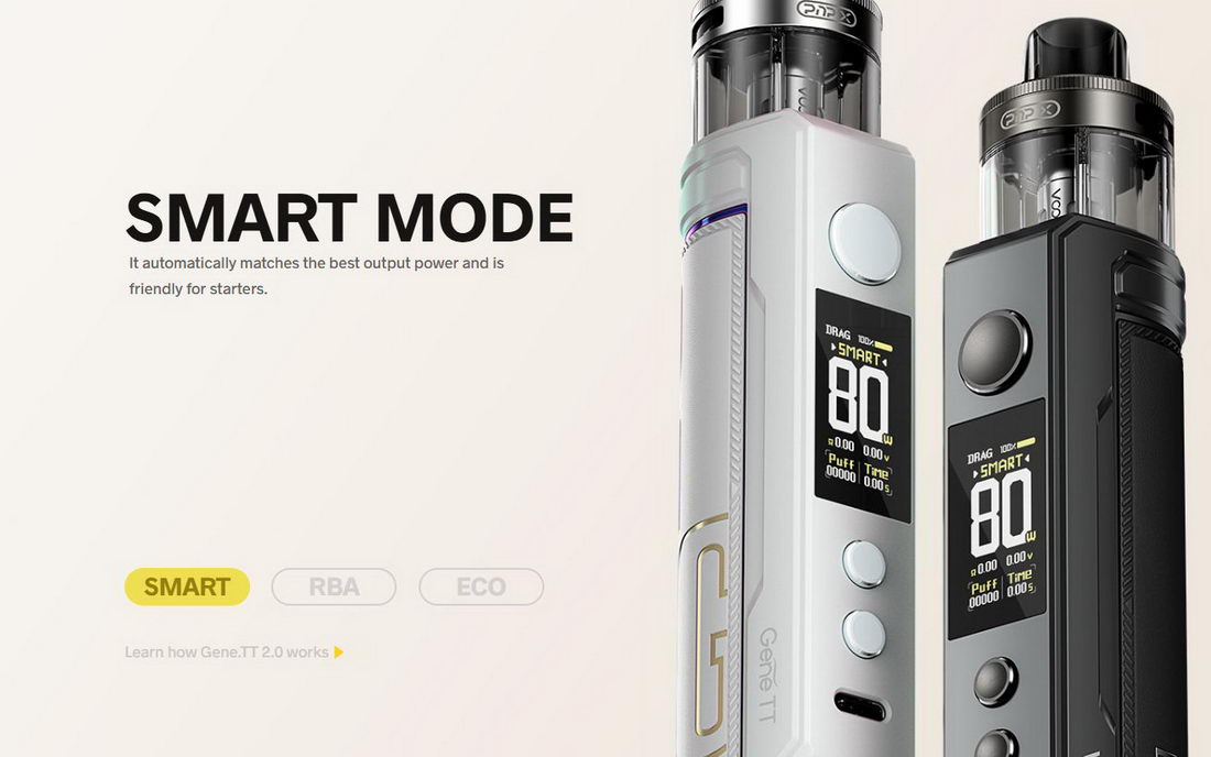 - SMART režim GENE.TT elektronike pomaže neiskusnim korisnicima, tako što pri ubacivanju kertridža sa zamenskom glavom očita otpor grejača i automatski postavi vrednost snage na preporučenu za taj otpor. U SMART režimu se izlazna snaga može postaviti samo u opsegu preporučenom za taj otpor grejača