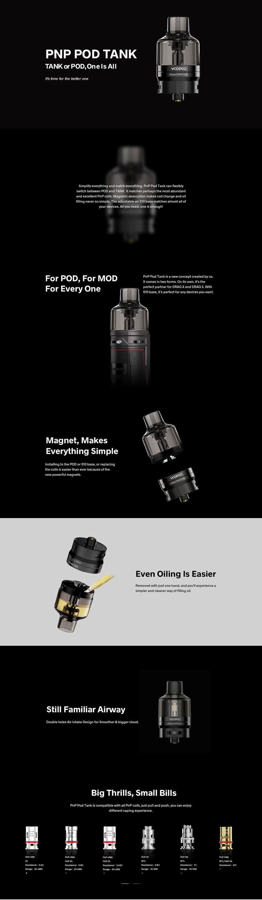 PnP kolekciju iz Voopoo-a odlikuje modularnost. Atomizere i uređaje (baterije) je moguće kombinovati direktno, ili uz male modifikacije. U skladu sa tim je dizajniran i PnP Tank atomizer, koji se sastoji od PnP POD tank kertriža (koriste ga Drag S i Drag X POD-ovi) i metalne baze sa 510 konektorom. Tank i baza su povezani jakim magnetima.