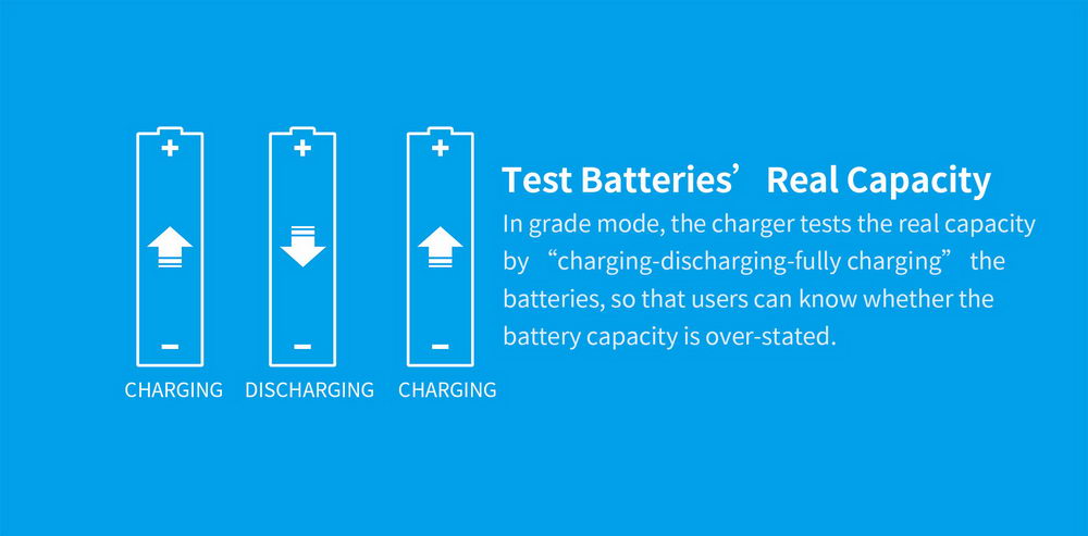 - GRADING je režim za proveru kapaciteta baterije. Uređaj će bateriju napuniti do maksimuma, potom isprazniti pa opet napuniti do maksimuma. Na taj način korisnik može pratiti promenu kapaciteta baterije tokom korišćenja